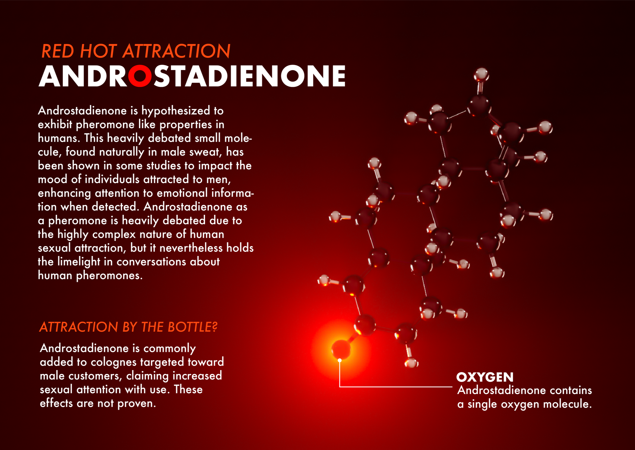 This model of androstadienone, a possible human pheromone, was designed to communicate the 3D structure while metaphorically depicting its function as a possible attractant. Data retrieved from PubChem.