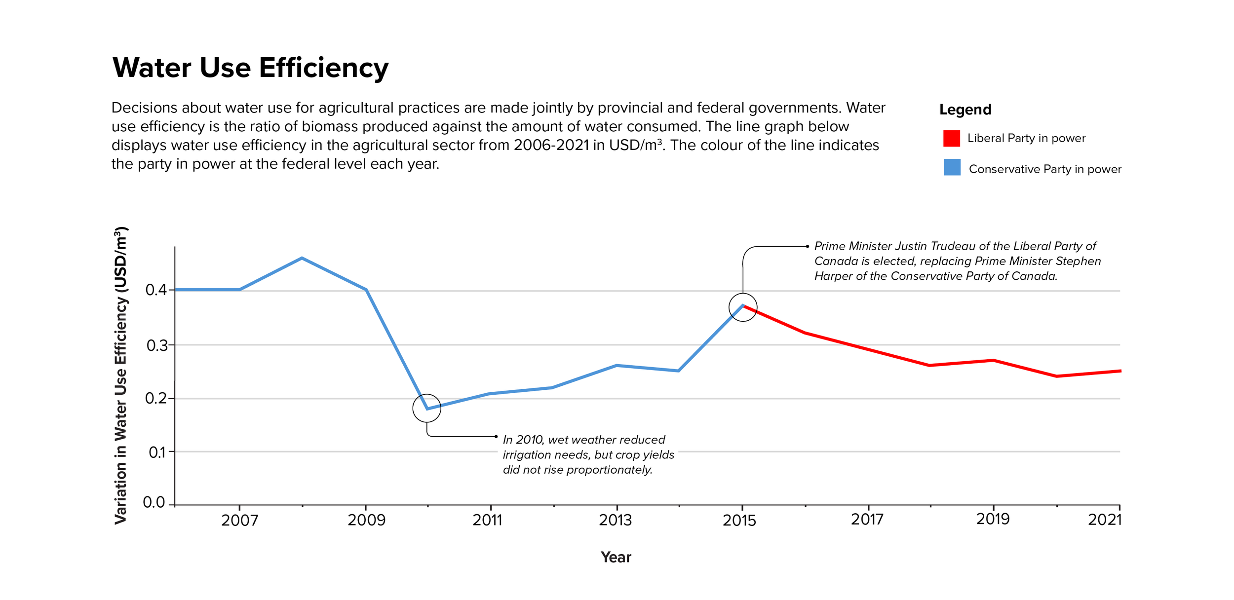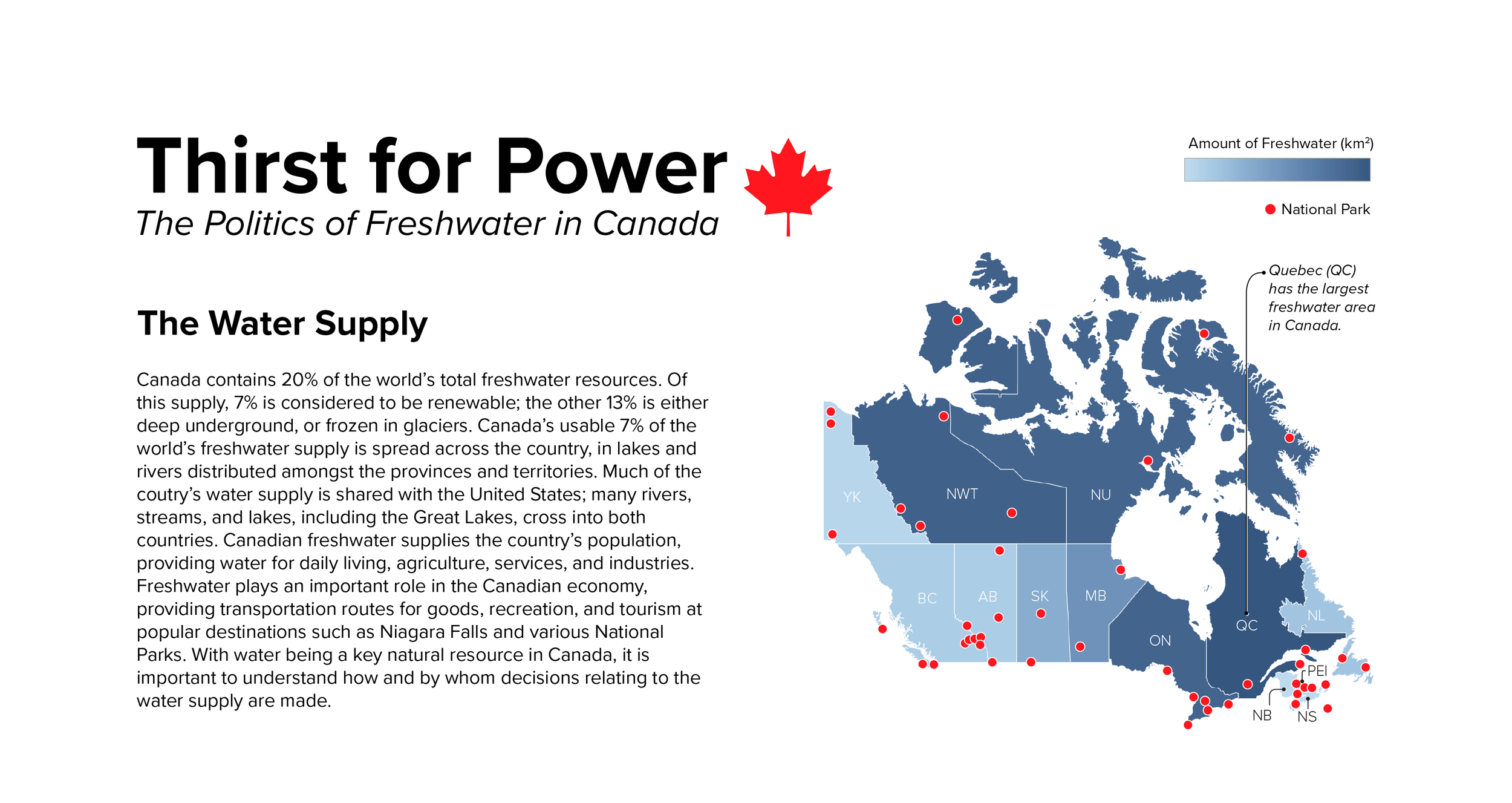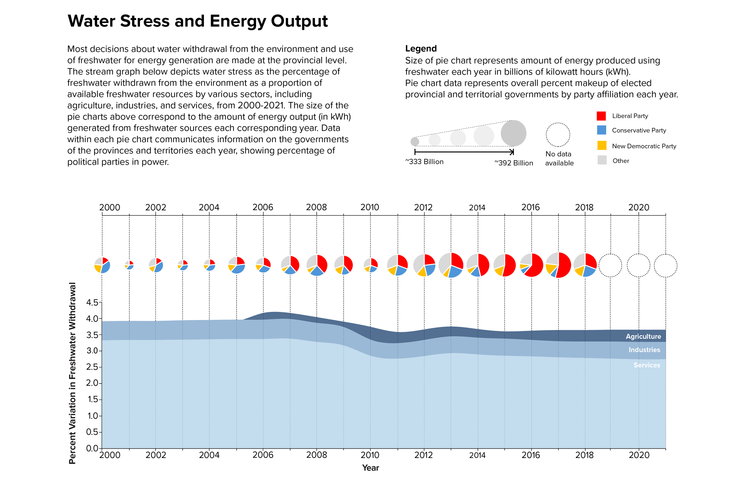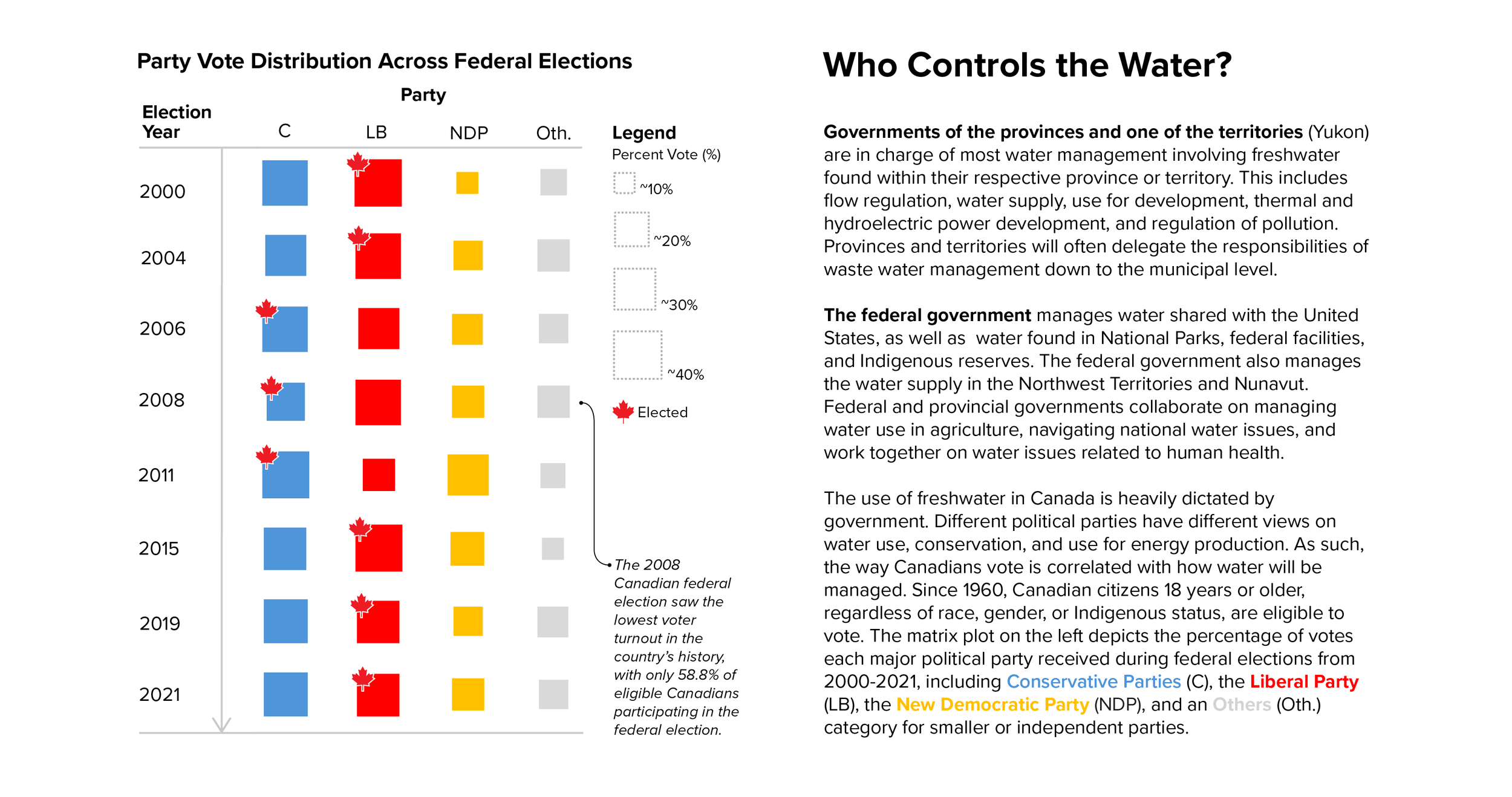 Integrating freshwater usage and elections data, this data visualization aims to educate Canadians on how political parties in power may impact how freshwater is used.